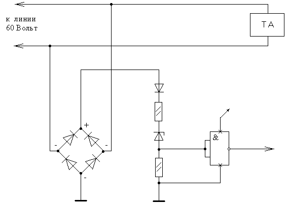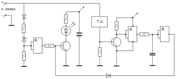 Напряжение телефонной линии поступает на преобразователь полярности, который обеспечивает определенную полярность напряжения на своем выходе не зависимо от полярности напряжения в телефонной линии. Это обеспечивает работоспособность прибора при перекоммутации линии на АТС. С выхода преобразователя полярности напряжение поступает на делитель напряжения и стабилизатор напряжения, которые вырабатывают постоянное напряжение питания для схемы прибора независимо от состояния линии (линия свободна, когда трубка лежит на ТА, при этом постоянное напряжение в ней 60В; линия занята, когда трубка снята, при этом напряжение в линии 5 15В). Делитель напряжения необходим для изменения масштаба напряжения до величины, обеспечивающей работу логической схем прибора (при наборе номера амплитуда импульсов 60В, а для нормальной работы микросхем – 2-3В). С выхода делителя напряжения импульсы набора поступают на схему подавления дребезга контактов (дребезг может приводить к неправильному определению набранной цифры из-за того, что счетчик будет считать импульсы дребезга). С выхода схемы подавления дребезга контактов импульсы набора поступают на схему выделения огибающей набора и счетчик-дешифратор набираемой цифры. Схема выделения огибающей набора формирует на своем выходе импульс, длительность которого примерно равна длительности набираемой цифры. Этот сигнал поступает на вход управления счетчика-дешифратора набираемой цифры. На счетный вход этого счетчика поступают импульсы набора. Таким образом, при наборе номера счетчик считает количество импульсов набора, а после прекращения набора цифры показания счетчика с некоторой задержкой, необходимой для анализа, сбрасываются, подготавливая счетчик для счета второй цифры набора. В схеме счетчика-дешифратора счетчик считает в двоичном коде, а дешифратор преобразует этот код в десятичный, что выражается в изменении состояния соответствующего выхода (выход 0 соответствует состоянию цифры 10). На счетчик-дешифратор количества набранных цифр поступают сигналы с выхода схемы анализатора состояния линии (на вх. управления) и с выхода схемы выделения огибающей набора (на счетный вход). Анализатор состояния линии формирует определенное логическое состояние, когда линия занята (снята трубка ТА) независимо производится набор или нет. Когда трубка снята – разрешается счет количества набранных цифр, когда линия освобождается – показания счетчика сбрасываются, подготавливая его к счету последующего поднятия трубки. Счетчик-дешифратор количества набранных цифр считает только до двух (после набора второй цифры с выхода 2 этого счетчика сигнал блокирует его собственную работу и работу счетчика-дешифратора набираемой цифры), что уменьшает вероятность сбоя логического анализатора при дальнейшем наборе номера. На вход логического анализатора поступают сигналы 0, 6, 1 от счетчика-дешифратора набираемой цифры и сигналы с выхода 1 счетчика-дешифратора количества набранных цифр. Для увеличения помехоустойчивости схемы работа логического анализатора разрешается сигналом с выхода анализатора состояния линии только при снятой трубке. «Отбой линии», т.е. кратковременное ее размыкание, происходит следующим образом: после набора запретного номера 061, логический анализатор запускает схему ждущего м