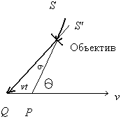 Рис. 5. Аберрация; наблюдатель, движущийся со скоростью v, увидит светило не в направлении SP, а в направлении S'Q