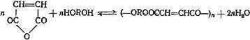 Следует учитывать, что при поликонденсации, в зависимости от условий проведения процесса происходит в большей или меньшей степени изомеризация цис-изомерных малеинатных звеньев в более устойчивые транс-изомерные фумаратные звенья, содержание которых в конечном продукте определяет многие его свойства (твердость, теплостойкость н др.). Посуществу, при использовании в поликонденсации в качестве кислотного агента малеиновой кислоты получаются полиэфиры, представляющие собой разнозвенные полимеры, которые являются сополимерами малеиновой и фумаровой кислот. Степень превращения зависит как от природы гликоля, так и от условий поликонденсации и может достигать 70—90%. Для облегчения удаления воды реакционную массу перемешивают, а в конце реакции нагревают в- вакууме. Чтобы ускорить процесс, иногда используют катализаторы (соли металлов; минеральные и органические кислоты, например n -толуолсулъфокислоту, и др.). Скорость поликонденсации зависит от состава исходных веществ. В реакциях малеинового ангидрида с различными гликолями активность гликолей возрастает в последовательности 1,2-пропиленгликоль < диэтиленгликоль < этилентликоль в среднем продолжительность поликонденсации в зависимости от природы исходных мономеров и условий проведения процесса составляет 6—20 ч, кислотное число получаемого полимера равно; 25—45 мг КОН/г полимера. Молекулярную массу полим-ера можно регулировать введением на определенной стадии процесса в реакционную смесь монокарбоновых кислот или одноатомных спиртов (например, уксусный ангидрид, циклогсксанол). В ряде случаев такая добавка улучшает последующую совместимость ненасыщенного полиэфира с мономером. Синтез ненасыщенных полиэфиров обычно осуществляют в аппаратах из нержавеющей стали или эмалированных. Технологическая схема производства аналогична получению других полиэфиров 2.2.1. Свойства полиэфирной смолы ПН – 1Ниже приведены некоторые показатели свойств отвержденного прлиэфира марки 1ВД-1: Плотность при 20о С, кг/м8 .........………………………………………………………………............1210—1250 Разрушающее напряжение при изгибе, МПа. ……………………………………………………… 70—100 Модуль упругости при изгибе, МШ ………………………………………………………………... 2200—2800 Ударная вязкость, кДж/м2 ……………………………………………………………………………... 6—12 Твердость по Бриннелю, МН/м2 ..........................................................................................................140—180 Теплостойкость по Вика, °С................………………………………………………………………...85—120 Удельное объемное электрическое сопротивление, Ом-м . ………………………………………..1 1О12 —5 1018 Диэлектрическая проницаемость при 10е Гц..... ……………………………………………………..4,4—5,2 Электрическая прочность, кВ/мн.........………………………………………………………………. 13—19 Практический интерес представляют и азотсодержащие ненасыщенные полиэфиры на основе малеинового ангидрида, модифицирующей дикарбоновой кислоты (фталевого ангидрида, адипиновой кислоты и др.), гликоля обычного типа (этиленгликоль, диэтиленгликоль) и двухатомного спирта, содержащего в своем составе третичный азот, в частности, N - фенил-бис(β-окси-этил) амина. Наличие в реакционной смеси такого азотсодержащего двухатомного спирта позволяет сократить продолжительность поликонденсацин в производственных условиях в 1,5— 2 раза и тем самым увеличить производит