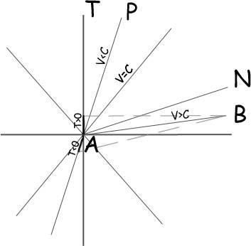 Представим себе следующий гипотетический случай. Из пушки, расположенной на Земле, произведен выстрел; скорость полета снаряда является сверхсветовой. В этом случае интервал между выстрелом и взрывом снаряда является пространственно-подобным. В системе Земли выстрел предшествует взрыву и является причиной последнего. Но мы могли бы найти такую систему отсчета, движущуюся относительно Земли с определенно выбранной скоростью (досветовой), наблюдатель которой зафиксировал бы, что вначале произошел взрыв, а затем выстрел. В данной системе отсчета следствие предшествовало бы причине во времени. Проиллюстрируем это на чертеже.Пусть АР