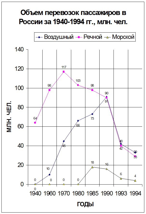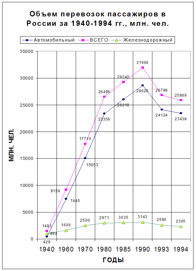 Объем перевозок пассажиров в России за 1940-1994 гг., млн. чел.