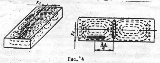 Щель в волноводе возбуждается тогда, когда она широкой стороной пересекает поверхностные токи, текущие по стенкам волновода. При возбуждении волновода волной Н имеет место поперечный ток и продольный ток на широких стенках волновода (рис.3,а). Эпюры распределения токов по поперечному сечению волновода приведены на рис.3,б. Поперечный ток в середине широкой стенки волновода равен нулю и нарастает до своего максимального значения к краям стенок. Распределение продольного тока представлено на рис.3,в.