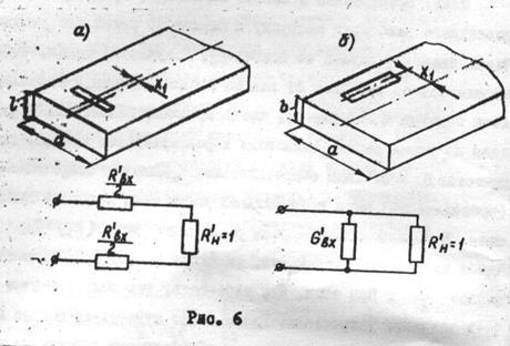Из рассмотрения формулы (7) следует, что входная проводимость продольной резонансной щели равна нулю, если щель находится в центре широкой стенки (х = 0), и максимальна, если щель находится на краю широкой стенки (х = a / 2) или на боковой стенке. К аналогичному выводу можно придти из рассмотрения рис.3 и 4.