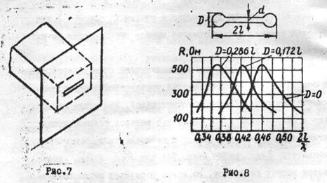 В тех случаях, когда излучатель должен быть более широкополосным, находят применение гантельные щели. Зависимость входного сопротивления гантельной щели от ее размеров приведена на рис.8. С увеличением диаметра закругления D точка резонанса смещается в сторону больших длин волн и полоса пропускания увеличивается.
