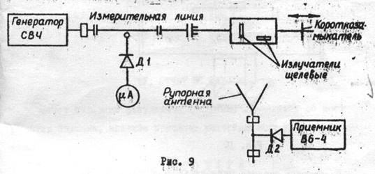 - подключить к генератору согласно схеме (рис.9) волновод с продольной и поперечной щелями. Переместить пластины со щелями так, чтобы середина поперечной щели оказалась симметричной оси волновода. Направить максимум излучения на приемную рупорную антенну. Зафиксировать наличие излучения с помощью приемника. Короткозамыкателем настроить щелевой излучатель на максимум излучения.
