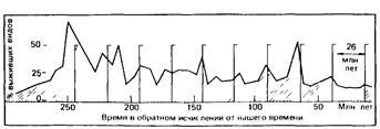 Откладывая на геологической шкале времени эпизоды массового вымирания (по горизонтальной шкале — время в миллионах лет в обратном исчислении от нашей эпохи, по вертикальной — процент выживших видов), палеонтологи обнаружили между ними регулярные интервалы в 26 миллионов лет (рис. 5). Очевидно, что такие вымирания земных живых организмов — процессы сложные и зависящие от множества причин: резких изменений климата, оледенений, флуктуации уровня океанов, уменьшений концентрации кислорода в водах морей и океанов, что вызывает кислородное голодание, и наконец, различных внеземных обстоятельств.