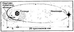 Во Вселенной существует большое количество парных звезд, обращающихся вокруг общего центра. Немезида (но имени древнегреческой богини, каравшей всех возвысившихся за надменность), полагают астрономы, если она действительно существует, должна совершать оборот но своей орбите за 26 миллионов лет. Сейчас она от Солнечной системы далеко, но примерно через 15 миллионов лет должна подойти на достаточно близкое расстояние к Солнцу (рис. 6).