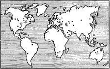 Как уже отмечалось выше, к настоящему времени установлено около 100 “астроблем”. Распределены они следующим образом (рис. 10): в Европе их насчитывается 30, в Северной Америке— 26, в Африке — 18, в Азии — 14, в Австралии — 9, в Южной Америке — 2.