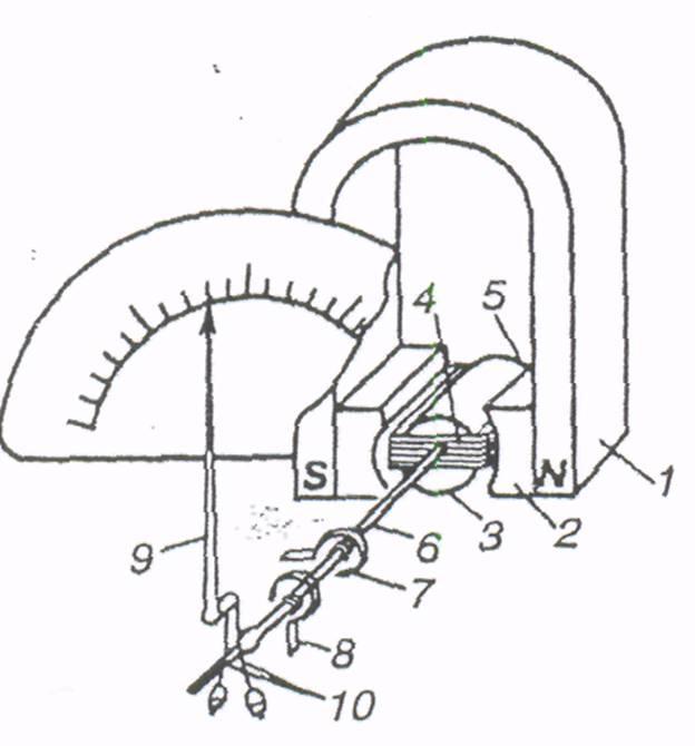 создают противодействующий момент и используются для подачи измеряемого тока от выходных зажимов прибора в рамку (механические и электрические соединения на рисунке не показаны). Рамка жестко соединена и со стрелкой 9