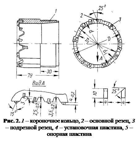 Забойный снаряд для бурения второй ступени скважины состоит из твердосплавной буровой коронки СМ6 (коронка применяется для бурения пород средней твердости, относящимся к IV-VII категориям по буримости, рис. 1