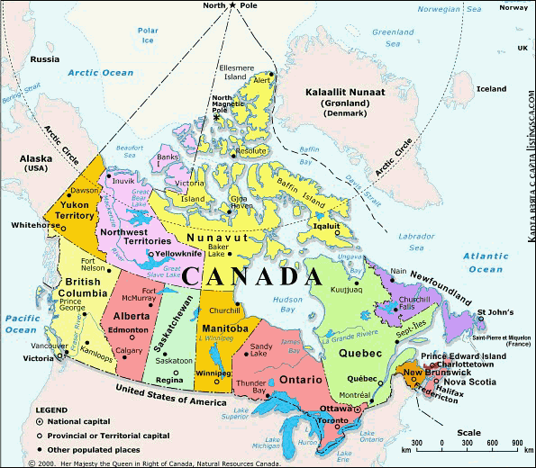 Канада является второй по величине страной в мире (9 970 610 кв. км.), которую превосходит по размерам только Россия. Канада расположена на север от США, между Атлантическим и Тихим океанами. С запада на восток она достигает 7700 км, а с севера на юг - 4600 км. Почти 90% всего населения Канады живут в пределах 160 км от границы с США. Столица Канады - город Оттава в провинции Онтарио.