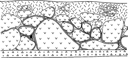 Значительно сложнее строение лавовых покровов, имеющих участки шаровой или подушечной текстуры. Шаровые или, как их иногда называют “подушечные” лавы (pillowlavas) известны в вулканогенных формациях любого возраста: от докембрийского до современного.