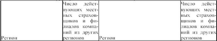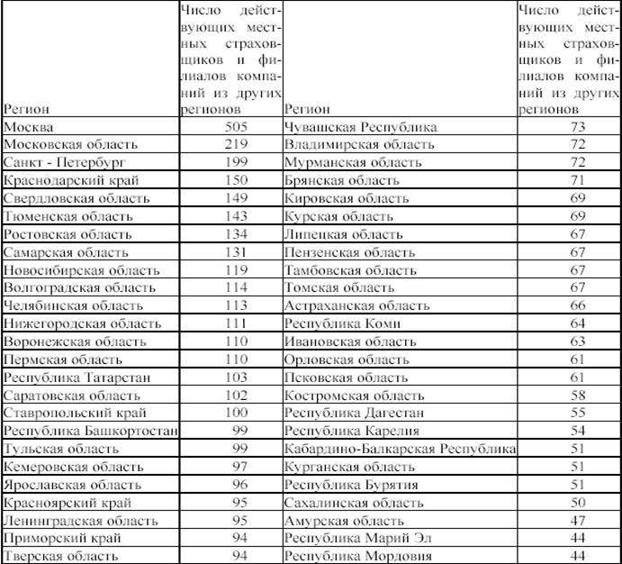 Присутствие местных страховщиков и филиалов компаний из других регионов представляет собой показатель развития местного страхового рынка – чем более привлекателен местный рынок, тем больше на нем концентрация страховых компаний. Наибольшее присутствие местных страховых компаний и филиалов страховщиков из иных регионов имеется в Москве, Московской области, Петербурге, а также Краснодарском крае, Свердловской и Тюменской областях. С этой точки зрения хуже всего дела обстоят в Республике Алтай, Еврейской автономной области, Ингушетии, на Чукотке и в Республике Тыва.
