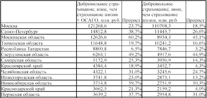 Если говорить о развитии страхового рынка в регионах, то наибольшие сборы премий по добровольному страхованию, иному, чем страхование жизни и ОСАГО приходятся на Москву и область, Петербург, Тюменскую область, Татарстан, а также Свердловскую и Самарскую области.