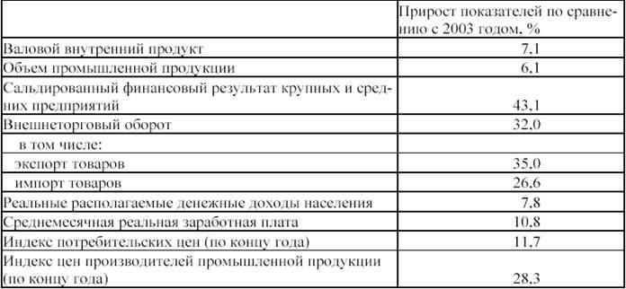 Тем не менее, эти показатели оказались ниже величин, зафиксированных годом ранее: в 2003 году рост ВВП составил 7,3%, а рост реальных доходов населения – 14,9%. На высоком уровне оказалась инфляция– более 28% в производственном секторе и 11,7% на потребительском рынке.