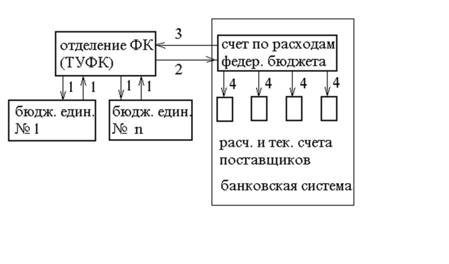 Цифрами обозначены: 1 - информационные потоки; 2 - платежный документ; 3 - выписка банка; 4 - перечисление бюджетных средств.
