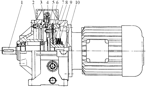 Рис. 1. Вариатор «Disco» фирмы «Lenze»: 1 – ведомый вал; 2 – неподвижное кольцо муфты; 3 – диск сателлитов; 4 – нажимное кольцо муфты; 5 – ось сателлита; 6 – сателлит; 7 – упорное кольцо; 8 – внутреннее солнечное колесо; 9 – пакет пружин; 10 – вал электродвигателя