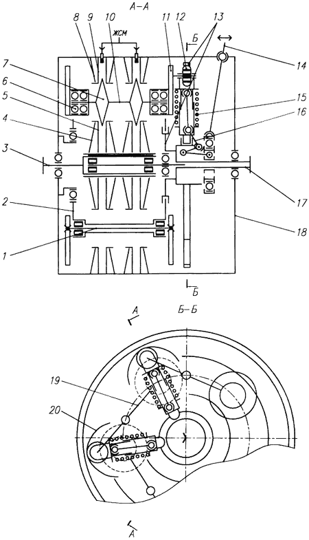 Рис. 3. Схема нового планетарного дискового прогрессивного вариатора: 1 – ось поворотных рычагов; 2 – водило; 3 – входной вал; 4 – тарельчатая пружина; 5 – внутренний центральный фрикционный диск; 6 – подшипники сателлитов; 7 – сателлит; 8 – плоская дисковая пружина; 9 – неподвижный внешний центральный фрикционный диск; 10 – ось сателлитов; 11 – противовес; 12 – ролик; 13 – прорезной диск; 14 – рычаг; 15 – пружина; 16 – рычажный механизм; 17 – выходной вал; 18 – корпус-эпицикл; 19 – поворотный рычаг; 20 – фасонная прорезь прорезного диска; ЖСМ – жидкий смазочный материал.