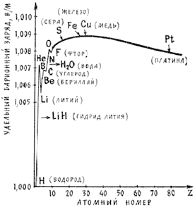 Прежде всего сразу становится ясным, что хотя искомое отталкивание составляет – даже в бытовом понимании – заметную часть от ньютонового притяжения (около 1%), измеряемая при изучении добавочного отталкивания величина окажется много меньше. В самом деле, мы собираемся сравнивать не отталкивание с притяжением, а различие в отталкивании тел разного состава. Это различие оказывается в несколько раз меньше самого отталкивания. Чтобы в этом убедиться, нужно подсчитать отношения барионного заряда к массе атома для разных элементов и их сопоставить (см. рис.1).