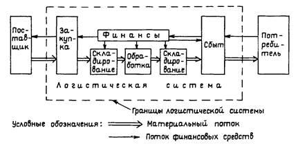 Границы логистической системы определяются циклом обращения средств производства (рис. 18). Вначале закупаются средства производства. Они в виде материального потока поступают в логистическую систему, складируются, обрабатываются, вновь хранятся и затем уходят из логистической системы в потребление в обмен на поступающие в логистическую систему финансовые ресурсы.