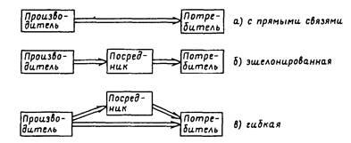 Здесь движение материального потока от производителя продукции к ее потребителю может осуществляться как напрямую, так и через посредников (рис. 20 в).