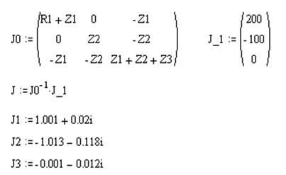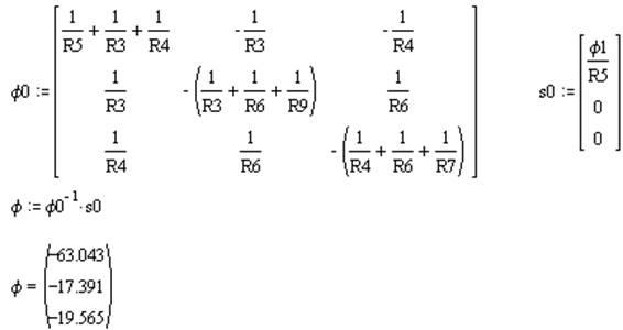 По 2-му закону Кирхгоффа:Для данной расчётной схемы составим матрицу, использовав метод узловых потенциалов :