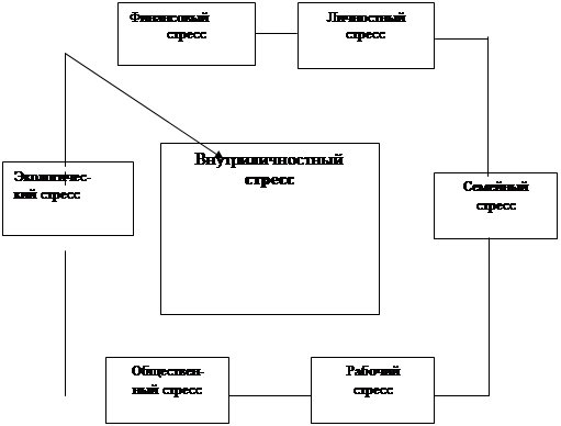 Следующая область – внутриличностный стресс. Большинство наших требований к внешнему миру и его воздействия на нас связаны с этим видом стресса. Эта область является как бы центробежной силой, которая оказывает влияние на все сферы нашей жизни. Если мы не находимся в мире сами с собой, то наше внутреннее смятение, переживание проявляется в негативном отношении, воздействиях на внешний мир и нарушает межличностные взаимосвязи. В эту категорию стресса входят такие события, как несбывшиеся ожидания, нереализованные потребности, бессмысленность и бесцельность поступков, болезненные воспоминания, неадекватность оценки событий и т.п.