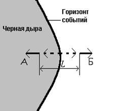 В вакууме постоянно рождаются и аннигилируют пары виртуальных частиц, которым, однако, не хватает энергии для превращения в реальные долгоживущие частицы. В достаточно сильном внешнем поле этот недостаток энергии может быть восполнен работой, производимой полем над частицами. Для появления реальной пары с энергией Е (сплошные линии) необходимо, чтобы ее компоненты, находясь еще в виртуальном состоянии (пунктир), разошлись на расстояние L, на котором работа поля равна Е. Одна из компонент пары (А) падает внутрь черной дыры, (Б) уходит наружу, к внешнему наблюдателю. Совокупность частиц Б и есть излучение Хокинга.