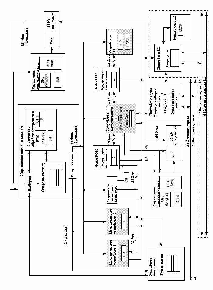 При обработке в процессоре команды распределяются по пяти исполнительным устройствам в заданном программой порядке. Если отсутствуют зависимости по операндам, выполнение происходит немедленно. Целочисленное устройство выполняет большинство команд за один такт. Устройство плавающей точки имеет конвейерную организацию и выполняет операции с плавающей точкой как с одинарной, так и с двойной точностью. Команды условных переходов обрабатывается в устройстве переходов. Если условия перехода доступны, то решение о направлении перехода принимается немедленно, в противном случае выполнение последующих команд продолжается по предположению (спекулятивно). Команды, модифицирующие состояние регистров управления процессором, выполняются устройством системных регистров. Наконец, пересылки данных между кэш-памятью данных, с одной стороны, и регистрами общего назначения и регистрами плавающей точки, с другой стороны, обрабатываются устройством загрузки/записи. В случае промаха при обращении к кэш-памяти, обращение к основной памяти осуществляется с помощью 64-битовой высокопроизводительной шины, подобной шине микропроцессора MC88110. Для максимизации пропускной способности и, как следствие, увеличения общей производительности кэш-память взаимодействует с основной памятью главным образом посредством групповых операций, которые позволяют заполнить строку кэш-памяти за одну транзакцию.
