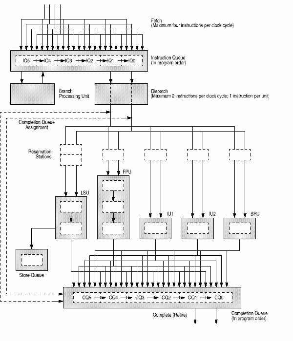 Как видно из рисунка, устройство управления потоком команд состоит из устройства последовательной выборки (fetcher), очереди из шести команд (instruction queue, IQ), устройства распределения команд и устройства обработки переходов (BPU). Оно определяет адрес следующей команды для выборки по информации из устройства выборки и BPU. Команда загружается из кэша команд в очередь команд. BPU извлекает команды перехода из последовательного загрузчика. Команды перехода, которые не могут быть обработаны немедленно, предсказываются с помощью специальных алгоритмов динамического или статического (определен архитектурой) предсказания переходов. Команды перехода, не влияющие на LR или CTR (регистры, содержащие адреса переходов), удаляются из потока команд. Команды из предсказанной ветви не завершаются, пока переход не обработан наверняка, сохраняя программную модель последовательного выполнения. Если переход был неправильным, устройство выполнения уничтожает все предсказанные пути команд и выбирает команды из правильной ветви.