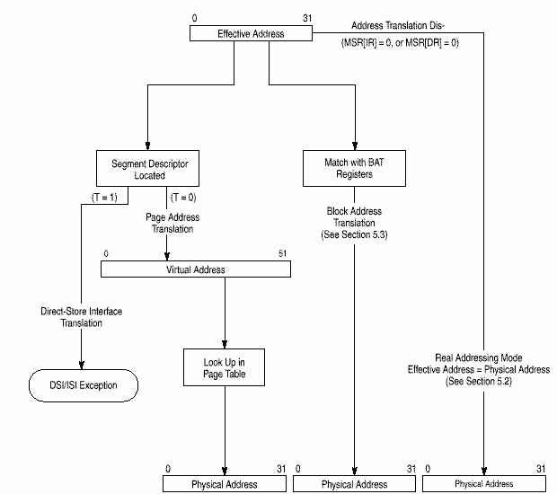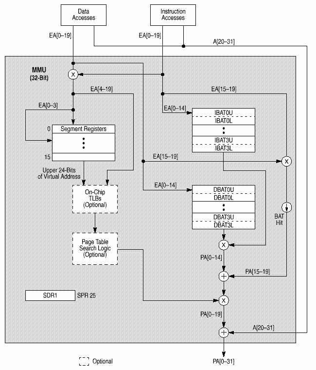 . MMU поддерживает до 4 Петабайт (252) виртуальной памяти и до 4 Гигабайт (232) физической памяти для команд и данных со страницами по 4 Кб и сегментами по 256 Мб. MMU контролирует привилегии доступа , разбивая память на блоки и страницы. Вообще, механизм преобразования адресов состоит в преобразовании эффективного адреса в промежуточный виртуальный исходя из сегментной информации и затем в физический по таблицам страниц. Дескрипторы сегментов, используемые для генерации промежуточного внутреннего адреса, хранятся как встроенные 32-разрядные сегментные регистры. В 750 реализовано 2 буфера TLB, так что доступ к TLB для команд и данных может производится независимо.