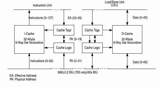 В 750 реализованы отдельные 32 Кб кэши для команд и данных (Гарвардская архитектура). Оба кэша восьмиканальные частично ассоциативные. По архитектуре PowerPC кэши адресуются физически, реальный адрес хранится в директории кэша. Оба кэша организованы в блоки по 32 байта. Блок кэша - блок памяти, для которого описано состояние когерентности. Для каждого банка данных кэша используется алгоритм PLRU (pseudo least-recently-used) замены данных (алгоритм изложен в документации). Когерентность данных глобальной памяти и данных в кэше производится по протоколу MEI процедурой слежения (snooping) по шине когерентности. Состояниякогерентностидлякэшаданных: Modified (Exclusive) (M), Exclusive (Unmodified) (E), Invalid (I). Для кэша команд: Invalid (INV), Valid (VAL). Каждый кэш можно сделать недействительным (invalidate) установкой соответствующих битов в специальных регистрах (HID0). При непопадании в кэш, блоки заполняются за 4 прохода по 64 бита. Двойные слова одновременно записываются в кэш и в запрашивающее устройство, минимизируя задержки. Оба кэша тесно связаны с устройством шины интерфейса (bus interface unit, BUI). BUI получает запросы от кэшей и выполняет эти операции в соответствии с протоколом 60х. BUI предоставляет очереди адресов, логику приоритетов и логику контроля шины. Кэш данных предоставляет буферы для сохранения и загрузки операций шины. Все данные из соответствующих адресных очередей помещены в кэш данных. В кэше данных также производится сохранение тэгов, требуемых для когерентности с памятью и замещение блоков кэша функциями PLRU. Кэш данных организован в 128 банков по 8 блоков. Каждый блок содержит 32 байта, 2 бита состояния и адресный тэг. Каждый блок кэша содержит 8 последовательных слов из памяти которые загружаются с границы в 8 слов (т.е. биты ЕА[27-31] равны 0): таким образом блок кэша никогда не пересекает границу страницы. Не выровненные обращения через границу страницы могут повлечь уменьшение производительности. Во время загрузки данных кэш не блокируется для внешних доступов до полной загрузки.  В течение такта кэш данных предоставляет для считывания в LSU двойное слово. Как и кэш команд, кэш данных может быть сделан недействительным (invalidated) весь или поблочно. Данные кэша делаются недоступными и недействительными сбросом HID0[DCE] и установкой HID0[DCFI], кэш данных может быть заблокирован установкой HID0[DLOCK]. Тэги кэша имеют один порт, поэтому одновременная загрузка/сохранение и обращения для когерентности кэша вызывают конфликт, при этом LSU внутренне блокируется на один такт для записи блока данных в 8 слов в буфер обратной записи. Кэш команд также состоит из 128 банков по 8 блоков. Каждый блок состоит из 32 байтов, 1 бита состояния и адресного тэга. За один цикл кэш команд предоставляет до 4 команд в очередь команд. В кэше команд поддерживаются только состояния верно/неверно (valid/invalid) для данных. Кэш команд не отслеживается, поэтому если изменяется память, данные которой содержатся в кэше, программа должна сообщать об этом устройству выборки команд. Кэш команд может быть сделан недействительным весь или поблочно. Доступ к кэшу запрещается и кэш делается недействительным сбросом HID0[ICE] и установкой HID0[ICFI], кэш блокируется установкой HID0[ILOCK]. В 750 реализован также кэш команд переходов (branch target instruction cache, BTIC). В BTIC хранятся встретившиеся в программе команды переходов/циклов. Если команда находится в BTIC она поступает в оч