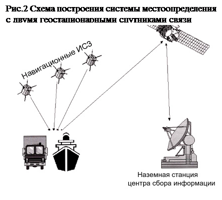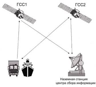 Схема построения системы местоопределения с двумя геостационарными спутниками связи представлена на Рис. 2. Примером таких систем могут служить системы EUTELTRACS (ECA) и GEOSTAR (США).