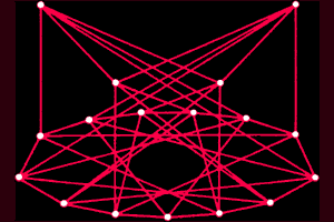 | Рис.1. Головоломка о вечеринке представляет собой задачу, типичную для приложений теории Рамсея. Какое количество людей достаточно для того, чтобы образовать группу, в которой всегда окажется либо четверо людей знакомых друг с другом, либо четверо, друг с другом незнакомых? На этом рисунке гости представлены точками. Каждое красное ребро на этом графе соединяет гостей, знакомых друг с другом, а каждое синее — незнакомых. В группе из 17 точек, изображённых на рисунке, невозможно найти четыре точки для которых сеть соединяющих их рёбер была бы целиком красной или целиком синей Поэтому требуется более 17 человек, чтобы среди них обязательно оказалось либо четверо знакомых, либо четверо незнакомых друг с другом. На самом деле во всякой группе из 18 человек всегда найдутся либо четверо знакомых, либо четверо незнакомых друг с другом. |