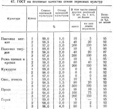 , нормируемым ГОСТом, относятся: чистота, всхожесть, наличие семян других растений, в том числе сорняков, наличие голых (обрушенных) зерен у пленчатых культур (кроме ячменя). По посевным качествам семена зерновых культур делятся на три класса (табл).