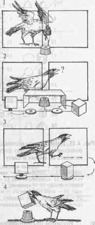 После того как голуби прочно усвоили каждый из УР, с ними снова провели тот же тест, что и в начале, когда подставка находилась в стороне от манипулятора, а пятно-мишень на полу отсутствовало. В этом случае задачу решили 4 голубя из 77. Поглядывая то на манипулятор, то на подставку, они начали постепенно передвигать ее на нужное место. Достигнув цели, голуби взбирались на подставку, клевали манипулятор и получали подкрепление. Напомним, что для формирования каждого из УР птицам требовались многие сотни сочетаний.