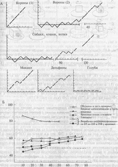 А — успешность решения задачи на экстраполяцию животными разных таксономических групп при ее первом предъявлении; по оси ординат — доля правильных решений в процентах (плоскость соответствует 50%-му случайному уровню правильных решений); Б — усредненные кривые успеха решения задачи при ее многократных предъявлениях животными разных таксономических групп (по Крушинскому, 1986). По оси ординат — как в случае А, по оси абсцисс — номера предъявлений.