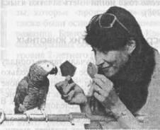 Несмотря на важность получения сравнительной характеристики когнитивных способностей этих высокоорганизованных птиц с крупным и тонко дифференцированным мозгом, экспериментального изучения практически не проводится. Исключение составляют только многолетние фундаментальные работы американской исследовательницы Ирэн Пепперберг (Pepperberg, 1981; 1987; 2000). Она разработала оригинальный метод общения с попугаем Алексом (африканским серым жако, Psittacus erithacus), причем в качестве языка-посредника использовалась собственно человеческая речь (рис.5).