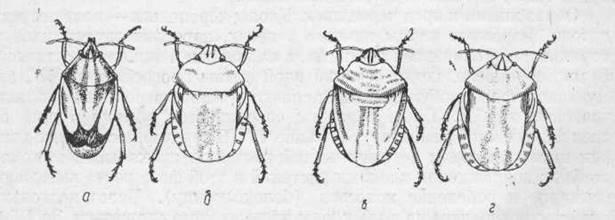а—остроголовая черепашка; б—вредная черепашка; в—маврский клоп; г—австрийский клоп (По Знаменскому)