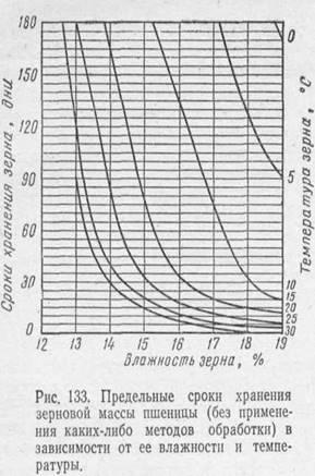 Семена могут прорастать при низких положительных температурах. Так, семена пшеницы, ржи, ячменя, овса, гречихи и конопли при наличии других благоприятных условий прорастают при 2— 5° С, подсолнечник и кукуруза — при 8—10° С. Такие температуры часто наблюдаются в зерновой массе и даже весьма желательны, как в значительной степени ограничивающие жизнедеятельность микроорганизмов, насекомых и клещей. Из этого следует, что температура редко бывает фактором, ограничивающим возможность прорастания семян при хранении.