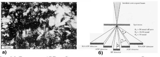 Название Z-контрасту было дано по высокоразрешающей методике обнаружения индивидуальных кластеров на кристаллической подложке Al2O3. На рис.3 показано соответствующее изображение и схема наблюдения. Регистрация изображения была в режиме СПЭМ с источником АЭП и круговым темнопольным детектором высокоугловым круговым темнопольным детектором (рис.3 б). Как видно, помимо ярких точек, обусловленных Z-контрастом, на изображении присутствует дифракционный контраст от кристаллической матрицы Al2O3, являвшемся нежелательным фоном.