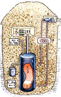 Такможетвыглядетькотелвзрывногосгорания. Встальнойемкости (1) содержитсянесколькодесятковтысячтоннтеплоносителя - жидкогонатрия (2). Заряд (3) собираютизотдельныхкомпонентовиопускаютвемкостьпоканалудоставки (4). Послевзрывагорячийжидкийнатрийпоступаетвтеплообменник (5), гдепроизводитсяводянойпарвысокогодавления. Парвращаеттурбину (6), соединеннуюсэлектрическимгенератором. Дляосколковделения (порядкатоннывгод) оборудованмогильник (7); "недогоревшее" топливо (уран, плутоний) ипродуктыреакции (гелий-3, тритий) направляютвпереработку.