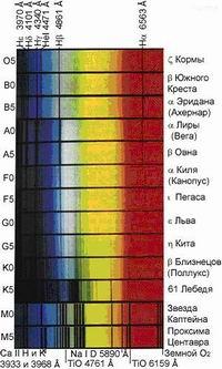 Почти все звезды имеют линии поглощения в спектре. Наиболее интенсивная линия гелия расположена в желтой части спектра: D3 (λ = 587,6 нм). В спектрах звезд типа Солнца наблюдаются также линии натрия: D1 (λ = 589,6 нм) и D2 (λ = 589,0 нм), линии ионизованного кальция: Н (λ = 396,8 нм) и К (λ = 393,4 нм). Фотосферы звезд дают непрерывный спектр, пересеченный отдельными темными линиями, которые возникают при прохождении излучения через более холодные слои атмосферы звезды. По спектру поглощения (точнее, по наличию определенных линий в спектре) можно судить о химическом составе атмосферы звезды. Яркие линии в спектре показывают, что звезда окружена расширяющейся оболочкой из горячего газа. У красных звезд с низкой температурой в спектре видны широкие полосы молекул окиси титана, оксидов. Ионизированный межзвездный газ, нагретый до высоких температур, дает спектры с максимумом излучения в ультрафиолетовой области. Необычные спектры дают белые карлики. У них линии поглощения во много раз шире, чем у обычных звезд и имеются линии водорода, которые отсутствуют при таких температурах у обычных звезд. Это объясняется высоким давлением в атмосферах белых карликов.