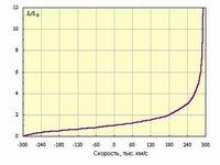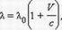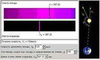 Продольный эффект Доплера. По оси абсцисс отложена скорость источника, по оси ординат – наблюдаемая длина волны. Смещение линий в спектре звезды относительно спектра сравнения в красную сторону говорит о том, что звезда удаляется от нас, смещение в фиолетовую сторону спектра – что звезда приближается к нам. Вследствие обращения Земли вокруг Солнца со скоростью V = 30 км/с, линии в спектрах звезд, удаляющихся от Земли, смещены в красную сторону на Δλ/λ = V/c = 10–4. Для линии λ = 500 нм смещение составит 0,05 нм (0,5 Å). Для звезд, приближающихся к Земле, линии будут смещены на такую же величину в фиолетовую сторону.