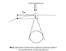 Усилим парадокс. Представим себе космический корабль, имеющий на борту двигатель, всегда ориентированный по радиусу, но в обратную сторону от Земли (Фиг.2)(Изображение слева) Двигатель показан на Фиг.2 в виде вытянутого треугольника. Представим себе далее, что космический корабль должен совершить облет вокруг Земли по круговой орбите, но тяготение отсутствует. Иначе говоря, уберем Землю и рассмотрим простой маневр корабля в пространстве. Очевидно, что для выполнения этого маневра при отсутствии тяготения космический корабль должен использовать свой реактивный двигатель. Сопло этого двигателя должно быть постоянно направлено в обратную сторону от центра окружности. Таким образом, силу земного притяжения мы заменяем силой тяги двигателя. Ясно, что в данном случае энергия будет расходоваться. Если бы взлетающая с Земли ракета просто зависла над землей на старте примерно на время полного оборота спутника на орбите (то есть около 100 минут), то она израсходовала бы приблизительно такую энергию. Причем понятно, что эта энергия прямо зависит от массы корабля. Любому человеку ясно, что эта энергия очень велика. Налицо парадокс. Способ устранения этого парадокса в классической физике - его игнорирование. Но как же можно преодолеть противоречие?