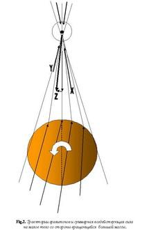 Таким образом вокруг вращающегося массивного тела возникает как бы "метелка" "вертушка", подгоняющая каждую элементарную массу планеты по касательной к орбите в направлении вращения основной массы. Поскольку воздействие производится на каждую элементарную часть планеты, то действие "метелки" пропорционально массе увлекаемого ею тела на орбите.