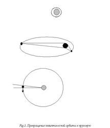 Угол, под которым видна планета из апогея спутника, существенно меньше угла, под которым она видна из перигея орбиты. Это приводит не только к тому. что (как уже было сказано) уменьшается сила приталкивания (притяжения), но пропорционально ей уменьшается и общий поток гравитонов, создающих затенение, а значит и относительное их количество, имеющее тангенциальный скоростной сдвиг. Поэтому в апогее спутник "подгоняется" вперед меньшим количеством гравитонов, а в перигее - бОльшим. См. Fig.3(изображение слева) Отсюда следует, в частности, что перигелий орбиты любого тела, вращающегося вокруг звезды, всегда должен смещаться, следуя за направлением вращения самой звезды. Поэтому при наличии гравитонного (да и любого другого) торможения эллиптическая орбита должна превратиться в круговую - ведь максимальное торможение будет иметь место на высокой скорости (в перигее), а минимальное - в апогее. Равновесие должно наступить на вполне определенной орбите. Грубо говоря, вначале эллиптическая орбита превращается в круговую, а затем уже радиус круговой орбиты постепенно «доводится» до устойчивого. На самом же деле эти процессы вряд ли можно разделить физически.