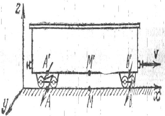В отличие от классической механики, в специальной теории относительности одновременность двух событий, происходящих в разных точках пространства, относительна: события, одновременные в одной инерциальной системе отсчёта, не одновременны в других инерциальных системах[1], движущихся относительно первой. На рисунке (см. ниже) расположена схема эксперимента, который это иллюстрирует. Система отсчета K связана с Землёй, система K’ — с вагоном, движущимся относительно Земли прямолинейно и равномерно со скоростью v. На Земле и в вагоне отмечены точки А, М, В и соответственно А’, M’ и В’, причем АМ=МВ и А’M’=M’B’. В момент, когда указанные точки совпадают, в точках А и В происходят события — ударяют две молнии. В системе К сигналы от обоих вспышек придут в точку М одновременно, так как АМ=МВ, и скорость света одинакова во всех направлениях. В системе К’, связанной с вагоном, сигнал из точки В’ придет в точку M’ раньше, чем из точки А’, ибо скорость света одинакова во всех направлениях, но М’ движется навстречу сигналу пущенному из точки B’ и удаляется от сигнала, пущенного из точки А’. Значит, события в точках А’ и B’ не одновременны: события в точке B’ произошло раньше, чем в точке A’. Если бы вагон двигался в обратном направлении, то получился бы обратный результат.