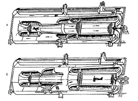 Движение воздушного потока в трубе при работе на трехметровом (а) и шестиметровом (б) сечениях