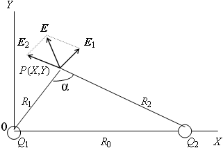 поля, создаваемые каждым из зарядов в точке наблюдения; объёмная плотность энергии поля W(X, Y), а также полные значения напряжённости E и потенциала φ в той же точке P(X, Y). Здесь же дано выражение для cosα, косинуса угла между векторами E1